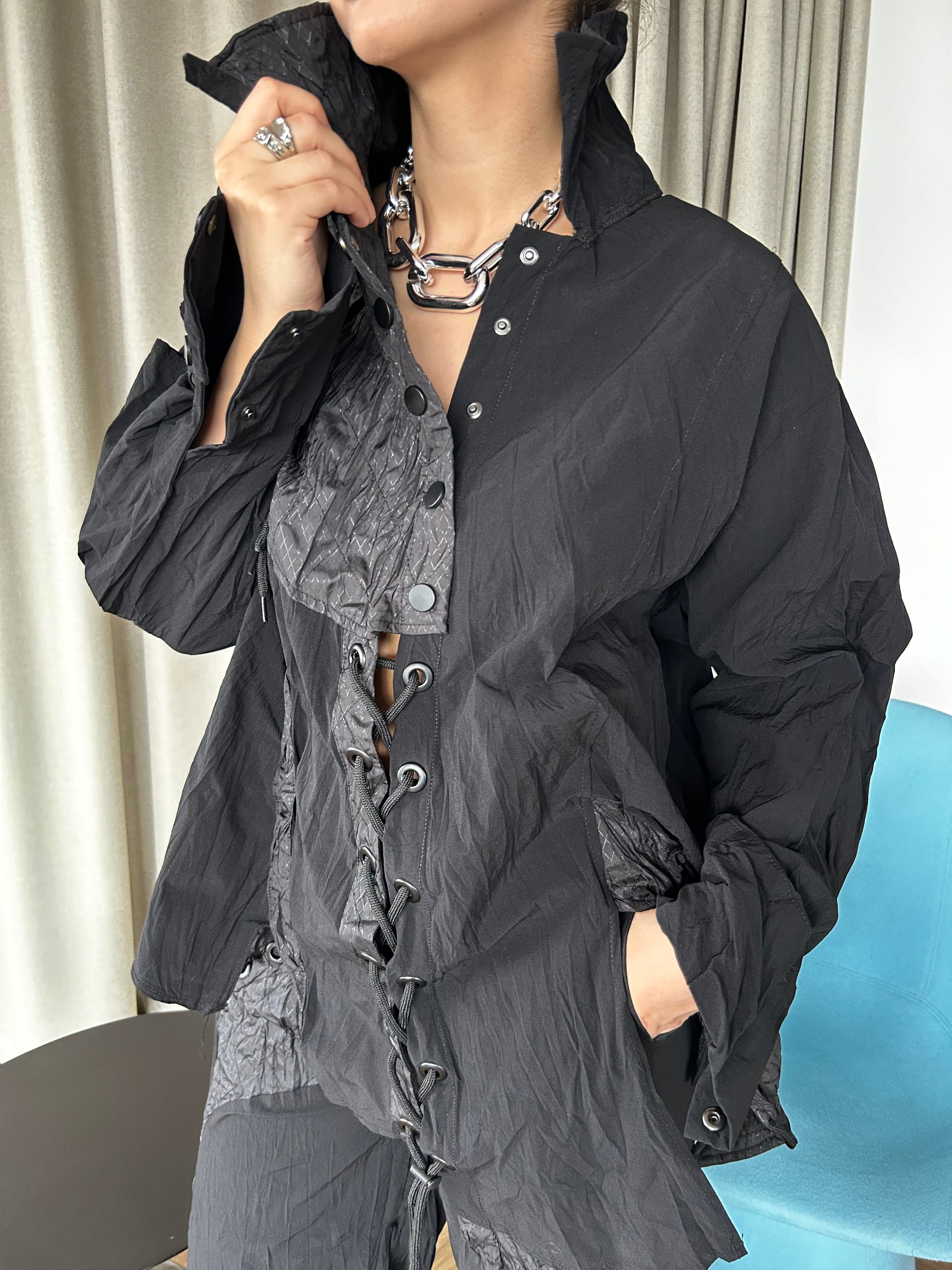 This captivating black blouse is a true masterpiece of deconstructed artistry, featuring a multi-layered, asymmetric silhouette that exudes modern edge. Crafted from a comfortable and durable woven blend of 87% polyamide, 3% cotton, and 10% elastane, it boasts unique textured panels, intriguing tie-up details, and a distinctive high collar that elevates its complex design. The irregular hemline and voluminous, architectural sleeves contribute to its dramatic and visually arresting appeal.