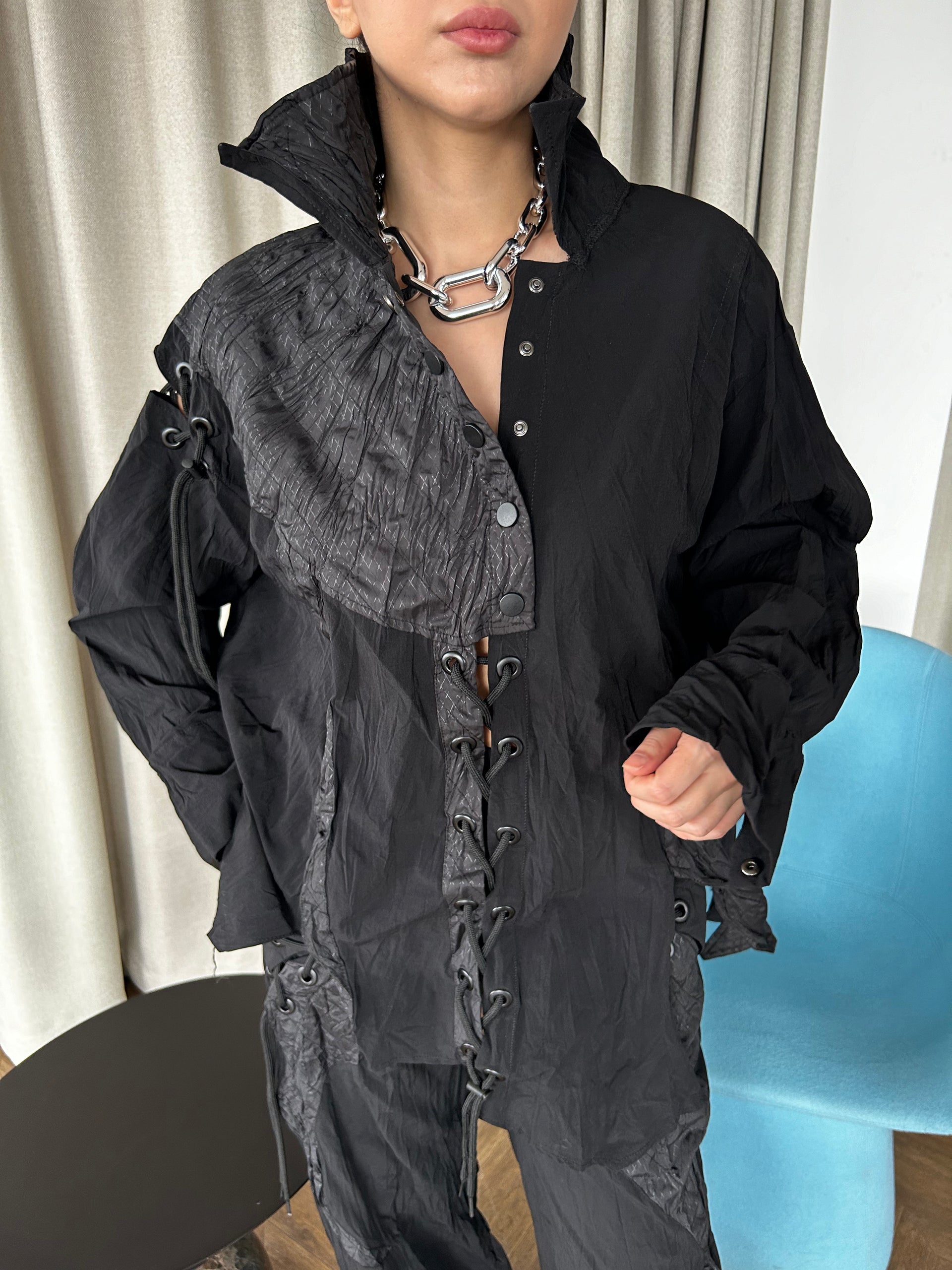 Designed for the fashion-forward woman who dares to stand out, this H4 London blouse is a statement piece that requires minimal styling. Pair it with sleek trousers or leggings to let its intricate details be the focal point, creating an avant-garde luxury streetwear ensemble perfect for gallery openings, urban events, or any occasion where unique style is celebrated.