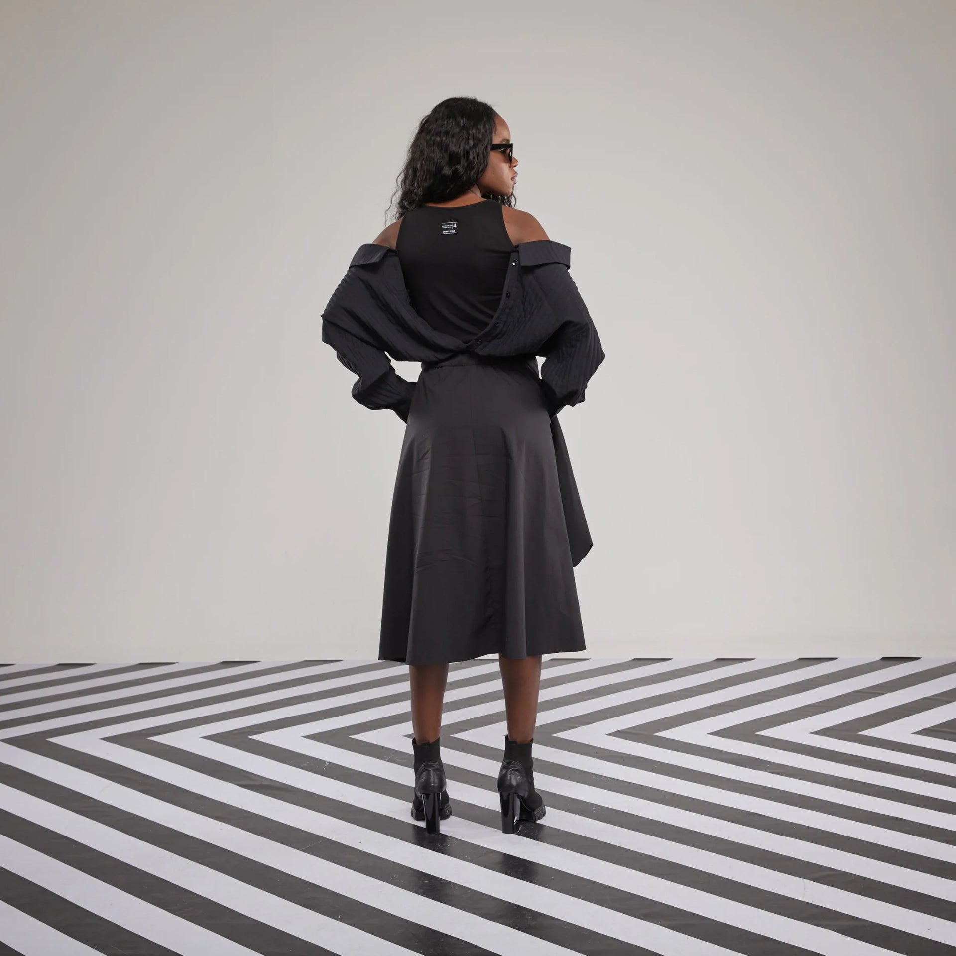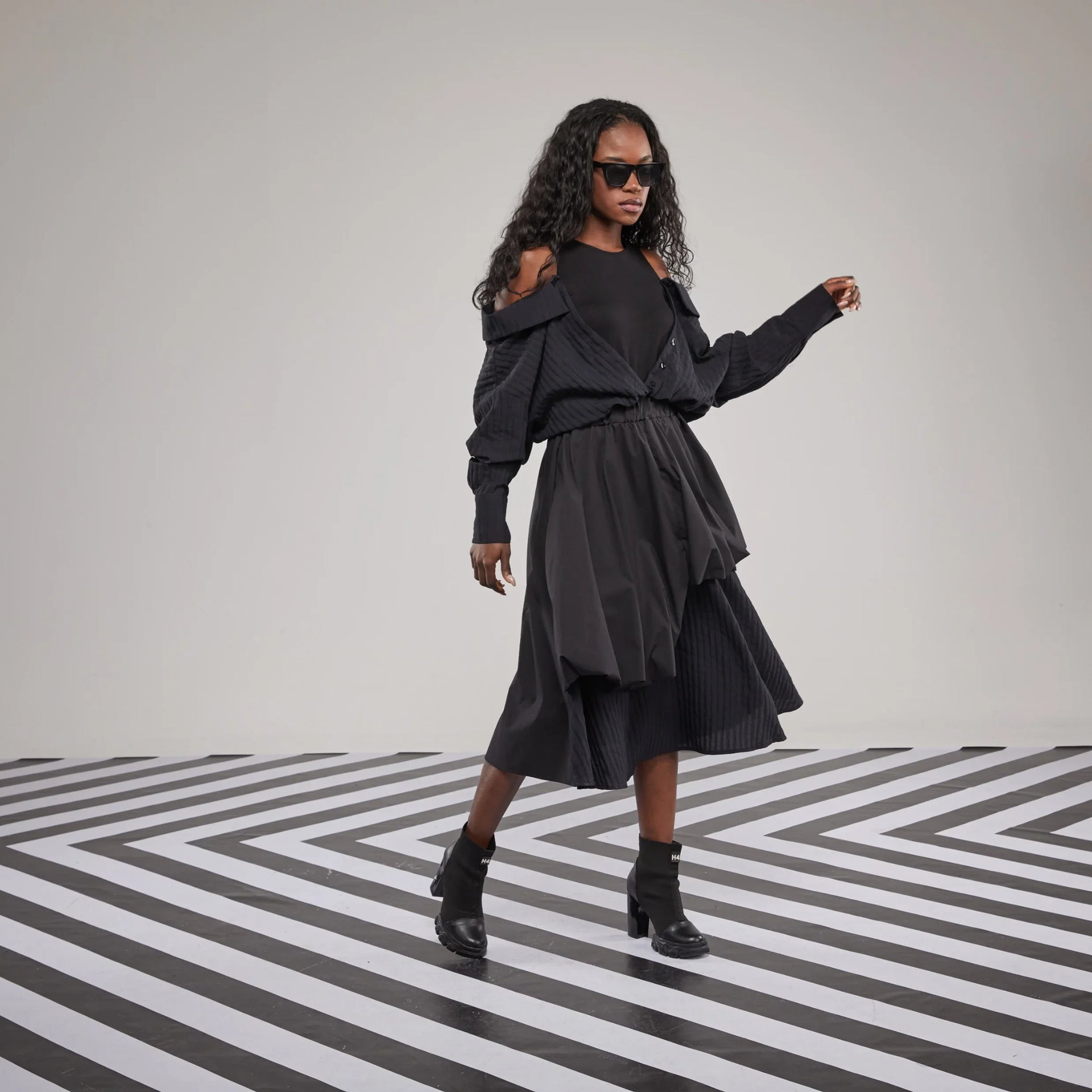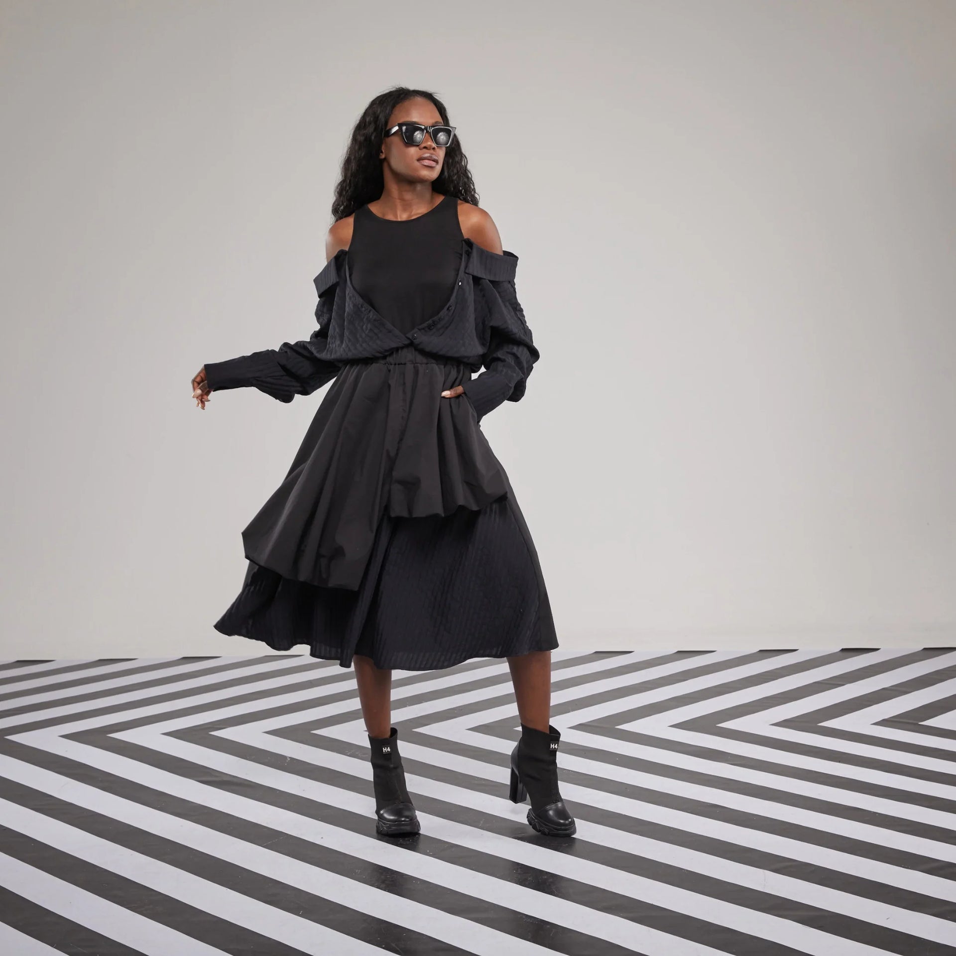 This captivating black midi dress is a masterpiece of deconstructed layering, presenting a complex yet harmonious silhouette. It features a sleek base dress (possibly a tank-style body) over which an intricately designed, asymmetric layered skirt creates dynamic movement and visual intrigue. The ensemble is completed by a unique deconstructed top layer, which appears as a cold-shoulder element, adding an edgy, modern twist. Crafted from a comfortable and durable woven blend of 60% cotton, 30% polyamide, and 10% elastane, this dress offers both structured elegance and flexible wear.